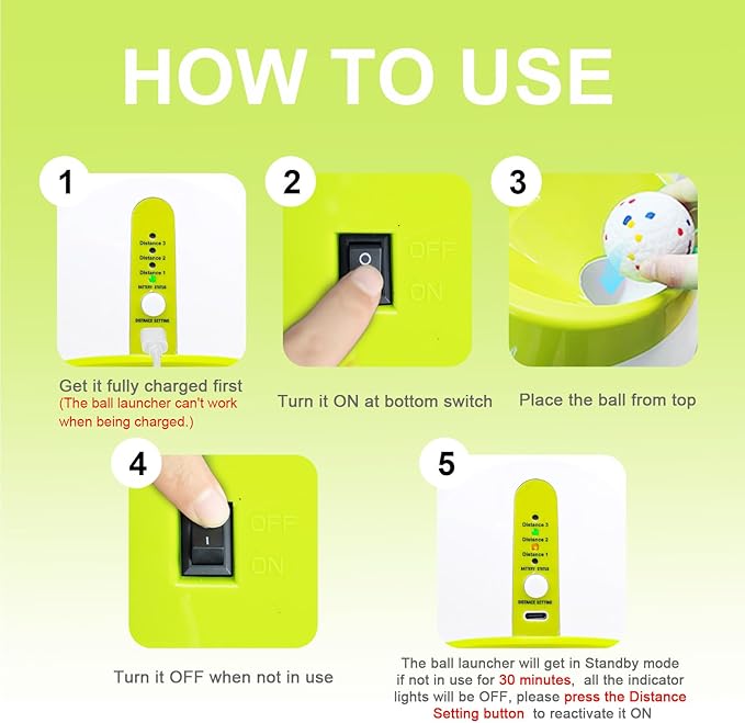 - Standby Mode: The dog ball launcher has a power-saving setting. Once it is turned ON but not used for 30 minutes, it will automatically enter standby mode, all indicator lights will turn OFF and it can't launch the ball. Please just press the Distance Setting button to reactivate the ball launcher.