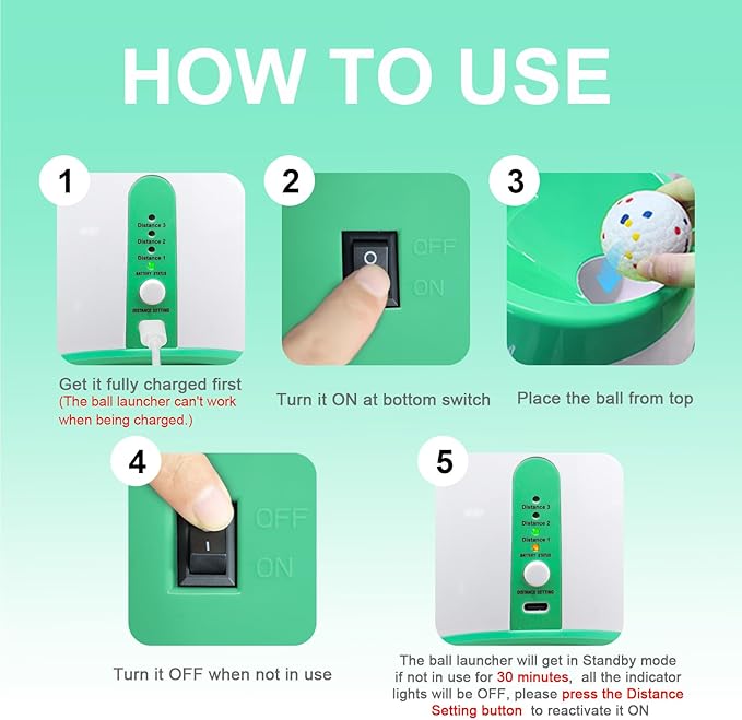 - Standby Mode: The dog ball launcher has a power-saving setting. Once it is turned ON but not used for 30 minutes, it will automatically enter standby mode, all indicator lights will turn OFF and it can't launch the ball. Please just press the Distance Setting button to reactivate the ball launcher.
