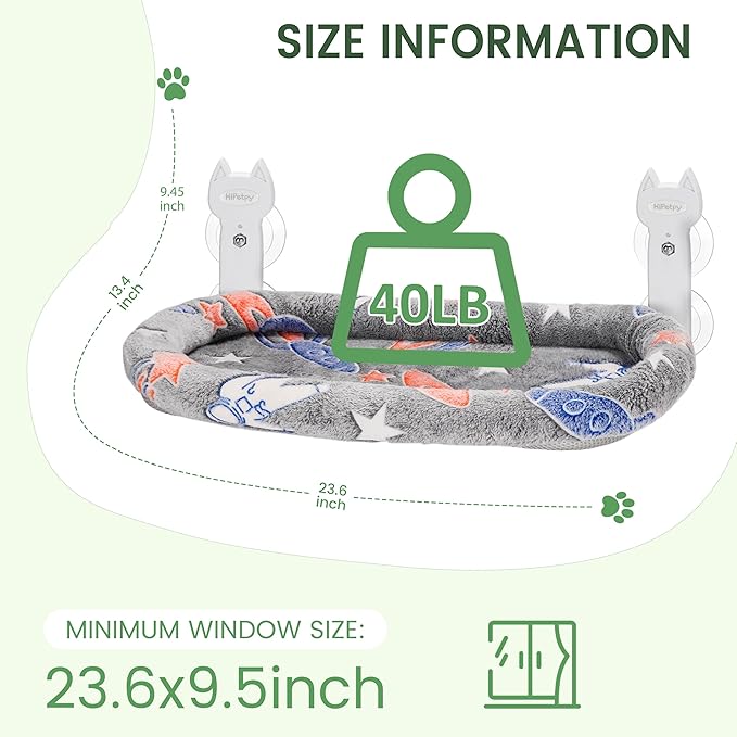 - 【Cordless Cat Hammock】 HiPetpy cat window perch measures 23.5 x 13.4 x 9.45 inches and supports cats weighing up to 44 lbs. Its cordless installation allows your cat to jump up and down freely.