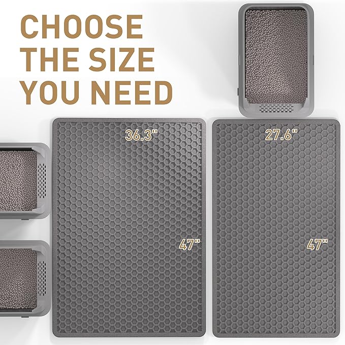 - 【Durable EVA Materials & Super Large Size】This 47"x27.5" large cat litter mat is made of premium EVA material that is ultra-soft, odorless, non-toxic, and resistant to cat scratches, not cheap foam-soft and safe for kitty's paws. Suitable for lots of type of litter box, such as kitty litter boxes, hooded or self cleaning litter box.