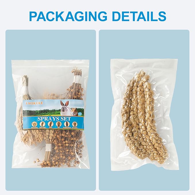 - TAOKEKE hamster spray set contains content: you will get wheat bouquet (35sticks), flax (50g), yellow millet (4sticks) and sorghum millet (25sticks), providing safe chewing toys and foraging rich toys for warehouses, sand, mice and other small pets