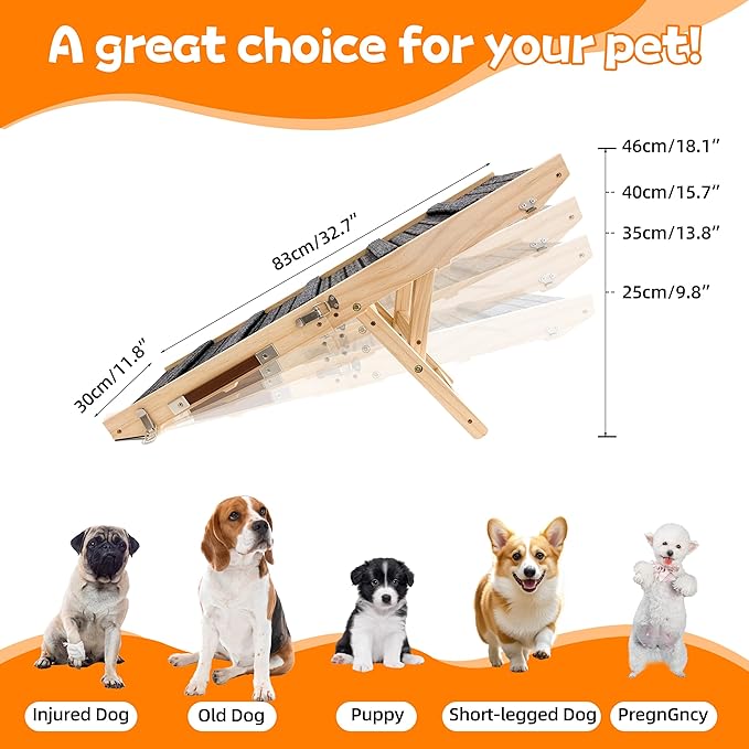 - 【3 Sizes Available】Crafted from durable pine wood, this dog ramp offers S/M/L sizes with anti-slip pads for secure climbing. Expands to 83cm, seamlessly fitting beds/couches to safely reach high spots. Ideal as dog steps for bed or furniture access