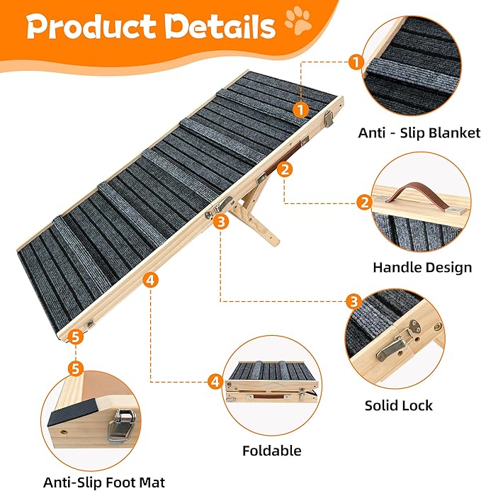 - 【Adjustable & Portable】Features 5-level height adjustment, a convenient carry handle, and dual screws with locks and stability. Perfect as a pet ramp for car or sofa—lightweight yet sturdy, easily transported between vehicles and indoor spaces