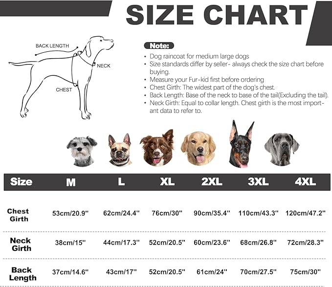 - MULTIPLE SIZES FOR MEDIUM TO LARGE BREEDS - The raincoat for dogs is available in sizes M to 4XL, designed to fit a wide range of medium and large dogs. Whether you have a Highland White Terriers, Boston Terrier, French Bulldog, Beagle, Schnauzer, Poodle, Boxer, Labrador Retriever, Bitter, Golden Retriever, Border Collie, Shiba Inu, Rowena, Doberman, Great Dane, German Shepherd, you’ll find a secure and comfortable fit. Ideal for daily use in wet seasons, muddy parks, or damp sidewalks.