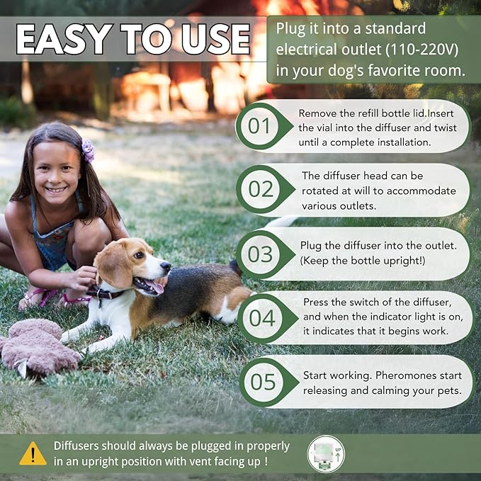 - Supports All Anxiety Triggers – Whether your dog is home alone, stressed by loud noises, fireworks, or thunderstorms, experiencing travel anxiety, or adjusting to new environments, this diffuser works as dog training & behavior aids, helping dogs feel safe, secure, and comfortable by mimicking natural maternal cues.