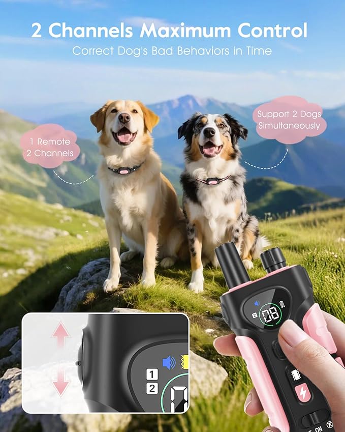 - 【4200ft Remote Range & 2 Channel】Shock collar for dogs covers up to 4200ft Remote Range for more performance training.With dual-channel,supports train 2 dogs simultaneously .You could train your dog in both the park, backyard, and different rooms without any burden