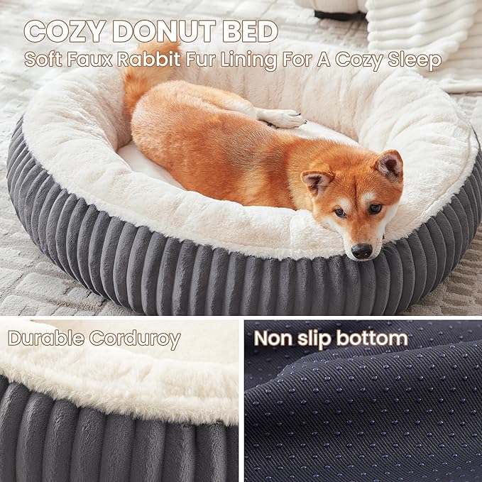 33 inches Donut Dog Bed for Medium Large Dogs,Calming Round Pet Bed with Removable Cover,Washable Milk Plush Faux Fur, Fits up to 50 lbs Pets(Dark Grey,M Plus)