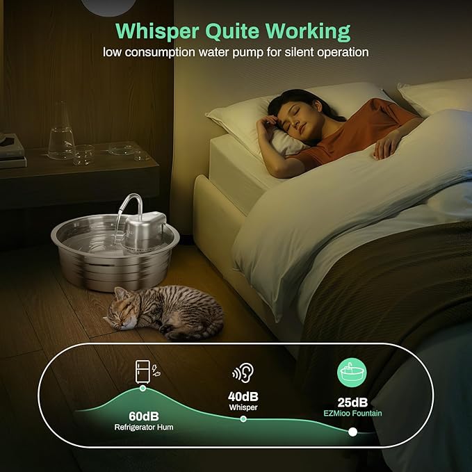 - 😽【ULTRA-SILENT PUMP & LOW CONSUPTION】: The fountain pump is ultra silent when running, keep it below 25db, only the sound of water flow can be heard. Even if it runs at night, it will not affect you and your pet’s sleep