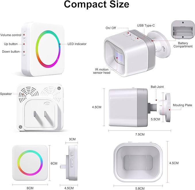 - Visual & Auditory Customization: Tailor the alert to your environment. Choose from 58 unique chimes and adjust the volume across 5 levels (0-110dB). Features a Silent Mode with LED Flash, perfect for hearing-impaired users or keeping the nursery quiet while still getting a visual notification via the bright LED indicator.