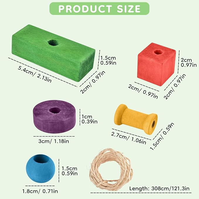 - Enhance Interaction & Maintain Freshness: DIY multi-shape parrot bite wooden blocks are brightly colored, which can effectively stimulate their curiosity and exploratory instincts, encouraging them to participate in the toy assembly process and enhancing interaction between you and your parrot. Additionally, by regularly disassembling and reassembling the toy shapes, you can keep the parrot's interest fresh and prolong the toy's lifespan (Warm note: To easily assemble the toy, thread the twine through the larger holes in the blocks)