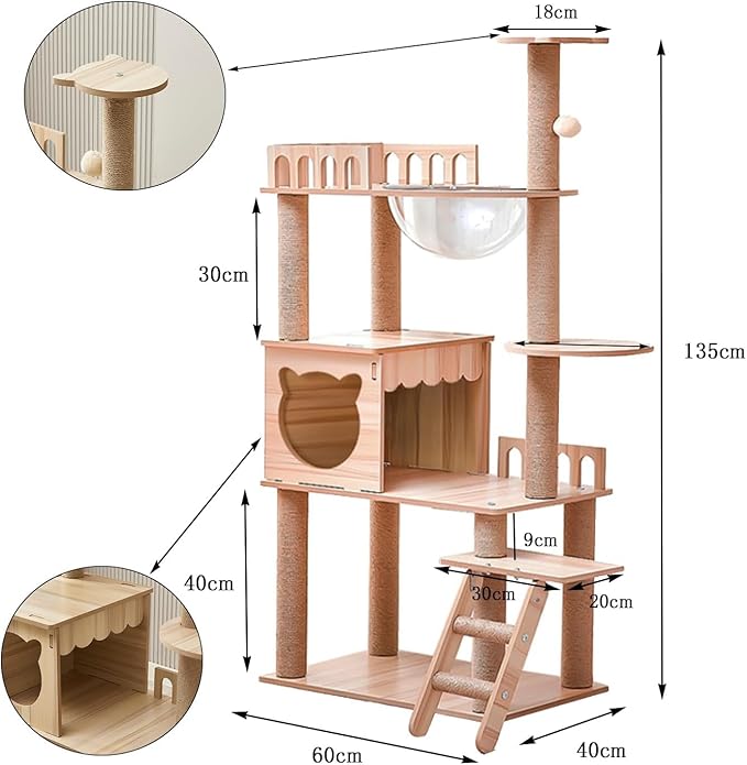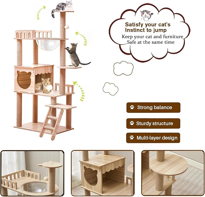 - 【Easy to assemble and clean】Wooden cat tower use Eco-friendly wood,Has strong moisture resistance, pressure resistance, stability, Good load-bearing performance,And is not easy to deform,The spaceship can be washed with water,The wooden surface can be wiped with a damp cloth to give.We will attach text explanations such as parts details, assembly methods, ca