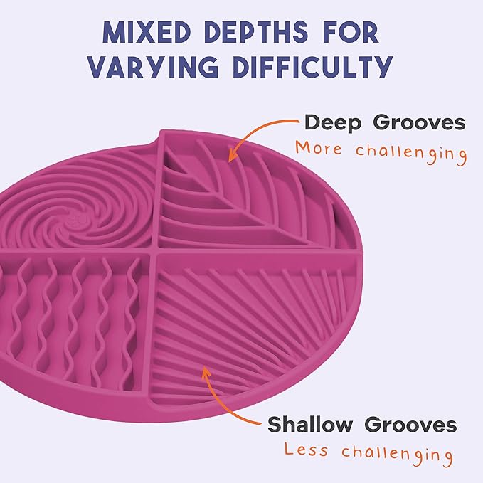 - MIXED DEPTHS FOR VARYING DIFFICULTY - The deep grooves of this universal feeder mat offer greater challenge, while the shallow grooves provide easier access to everything from peanut butter to meats, fish, fruits, and veggies. Cats, kittens, dogs and puppies of all breeds and sizes will fall in love with the stimulation of the four textured sections!