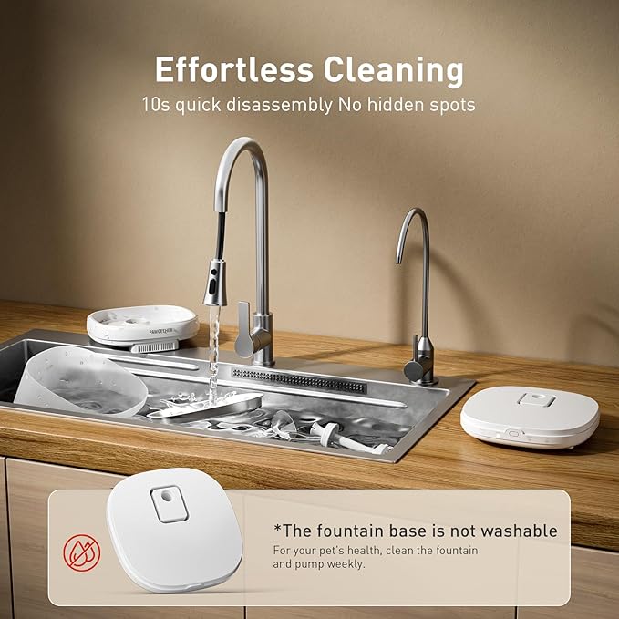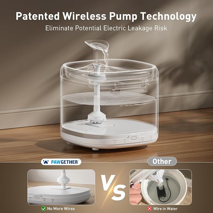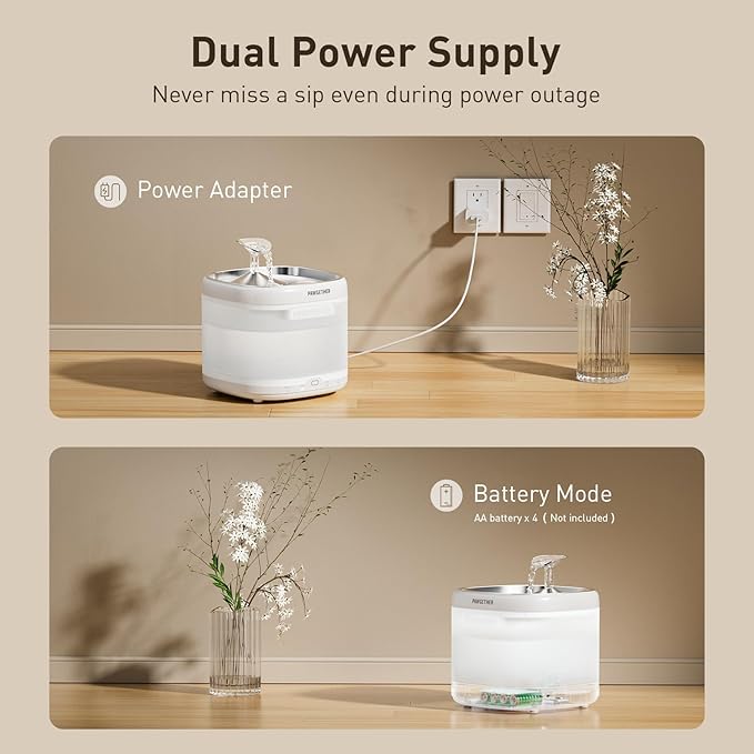 - 【True and Reliable Water-Electricity Separation】The stainless steel cat water fountain uses a wireless pump to ensure that cats & dogs are not at risk of electric shock. This cat water dispenser is engineered with advanced technology to ensure a complete and reliable separation of water and electricity. This innovative approach not only meets but exceeds safety standards, providing you with unrivaled peace of mind during use. NOTE: Please search "B0D2L6HH2N" to purchase the official filters