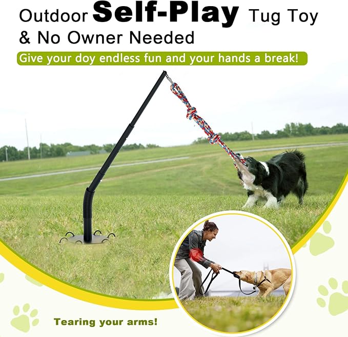 - Outdoor Tug Dog Solo Play Toy - Hands-Free Fun: Designed for solo play, this spring-powered dog tug toy creating a realistic "pull-back" effect just like a real tug-of-war rival. Without needing you to hold the rope, keeping your dog engaged happily—perfect for energetic and chewy breeds. Got this outdoor tug toy for dog, give your pup endless fun and your hands a break!
