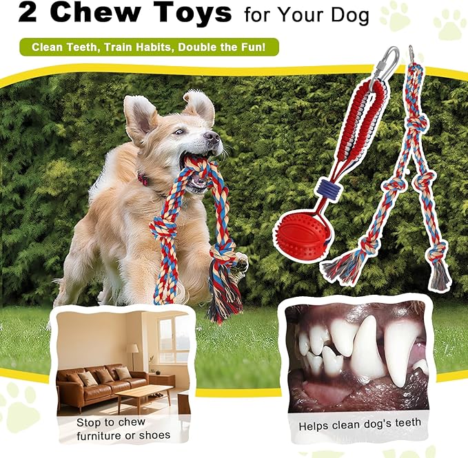- 2 Chew Toys for More Fun: This Dog Tug-of-War Toy Set comes with 2 durable chew toys, a soft cotton rope for tugging, and a chew ball—everything to keep your dog entertained. Not only does it help clean their teeth, but it also redirects their chewing instincts away from your shoes and furniture. Say goodbye to destructive habits and hello to happy, healthy play!