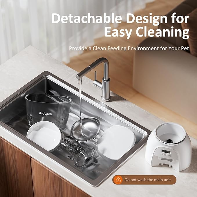 - 【User Friendly Operation】The auto pet feeder with Intuitive LCD screen makes setup and programming a breeze, and press both "+ & -"together to manually dispense 1 portion; All food-contact components, including the food tank and food bowl are detachable and washable, making it easy to keep your feeder fresh and hygienic. Spend less time cleaning and more time with your pet. The 12-hour clock is easy to program and understand.