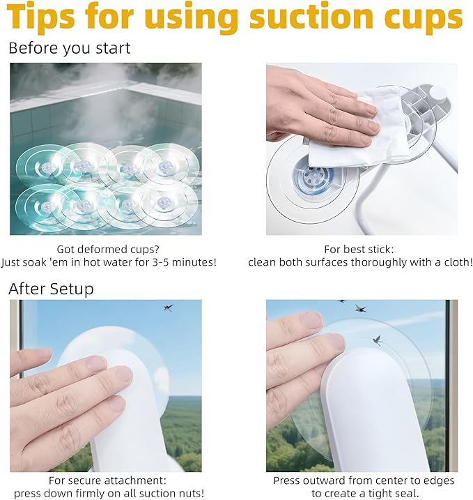 - Installation Tips: Clean the window & suction cups. Attach, press nuts firmly, then expel air by pressing cup rims. If cups fail, soak in 90°C water for 3 minutes to restore shape