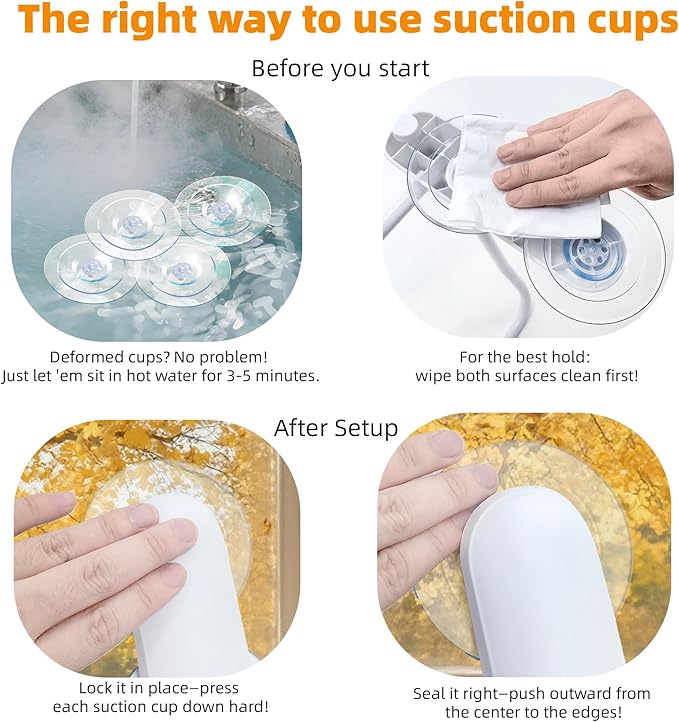 - Installation Tips: Clean the window & suction cups. Attach, press nuts firmly, then expel air by pressing cup rims. If cups fail, soak in 90°C water for 3 minutes to restore shape