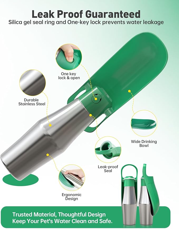 - Safe, BPA-Free & Eco-Friendly Design: Made from BPA-free dog bottle materials and durable, food-grade stainless steel, this eco-friendly pet bottle offers a safe way to hydrate your pet on the go. Its non-toxic dog travel bottle construction ensures your pup stays healthy while you reduce plastic waste. A reusable, safe dog water dispenser for conscious pet parents who care about their dog and the planet. The perfect reusable dog bottle for every eco-minded household.