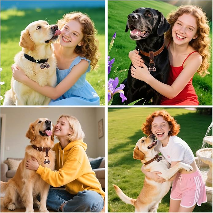 Loud Dog Collar Bells, Durable Pet Bells Tracker for Large Dogs, 4 Copper ells and 2 Leather Button Strap for Outdoor Safety, Pet Tracking, Hiking, Walking
