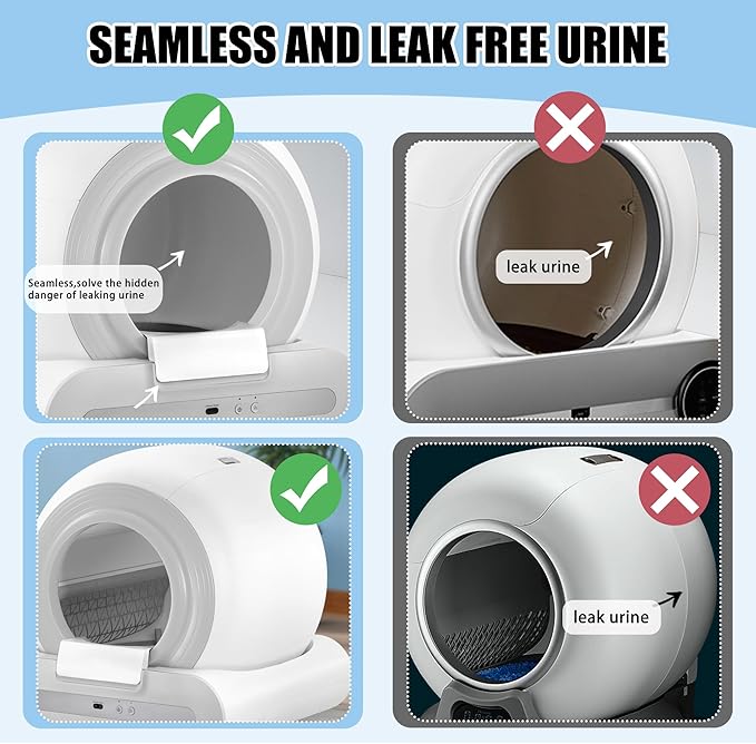 - 【Seamless Design】 Our self cleaning litter box showcases a seamless barrel design equipped with four gravity and infrared induction sensors, ensuring a safe environment for your feline companion by notably minimizing the risk of potential injuries. This automatic cat litter box self cleaning not only eliminates the concern of urine leakage but also prioritizes the well-being of your beloved pet.