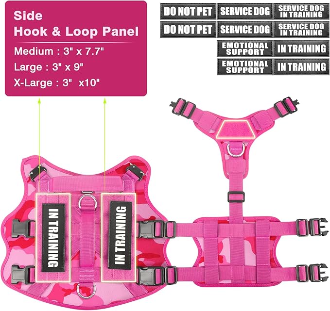 - 【Molle System】: Equipped on both sides for pouches, water bottles, and tactical dog gear. Multiple Hook & Loop Panels for morale patches and badges to showcase your dog’s personality. A wide range of use for personal service, law enforcement, or outdoor recreation. The package contains a dog harness, and 10 pieces of dog patches, such as Service dog, do not pet, in training, emotional support and service dog in training, enough quantity for you to decorate the dog’s vest harness.