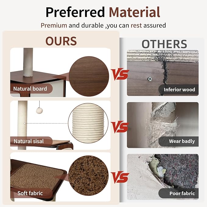 - 🏡 MODERN HOME DECOR COMPATIBLE Dark wood grain with soft beige plush. This cat tree complements modern interiors seamlessly — no more “ugly pet furniture” cluttering your living room.