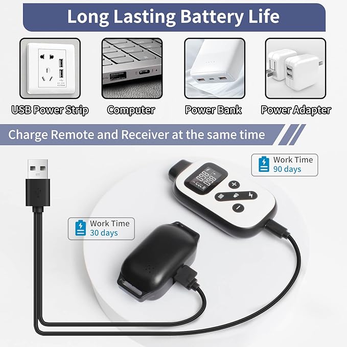 - 【 Waterproof and Battery 】 The automatic bark collar has an IPX7 waterproof and long-life battery. The work time after a full charge is 90 days for remote control and 30 days for receivers.