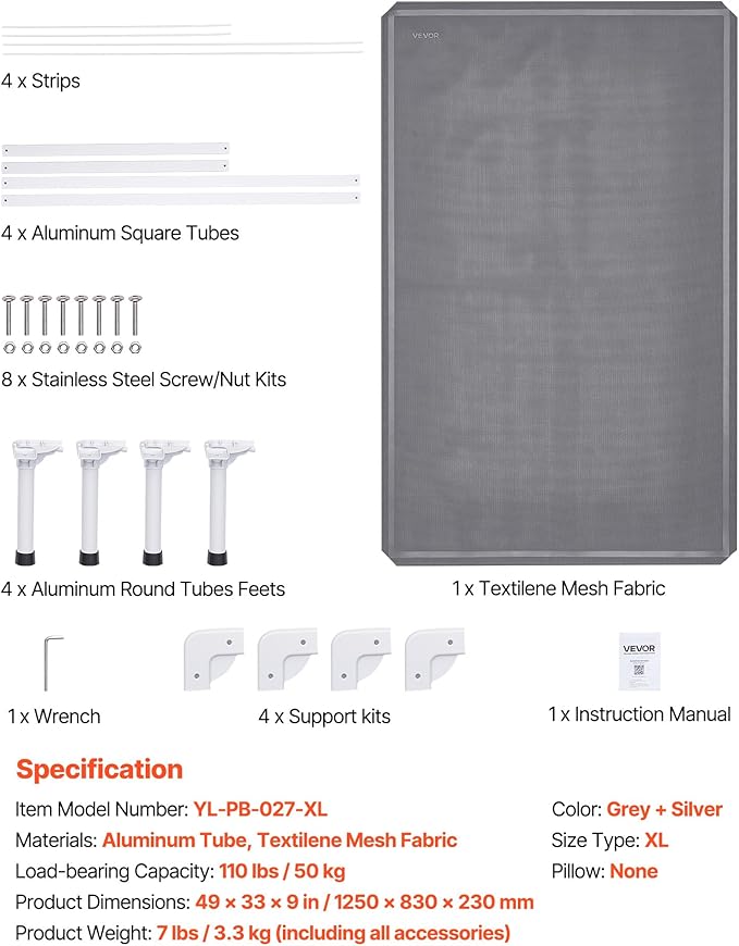 VEVOR Chew Proof Elevated Dog Bed, Portable Raised Dog Cot with Aluminum Tube Metal Frame and Breathable Textilene Mesh, Indoor & Outdoor Pet Cooling Raised Hammock Bed, XL, Gray