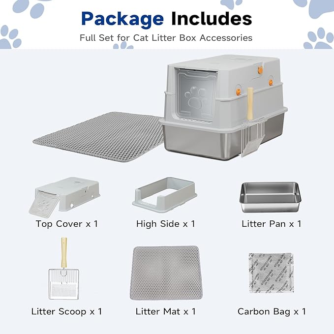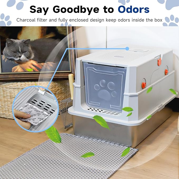 - 【ODOR CONTROL WITH ENCLOSED DESIGH】: The enclosed litter box with pre-installed carbon filter and odor-resistant stainless steel pan, effectively minimizes the unpleasant smell to keep your home smelling fresh and offer a privacy & hygientic space for your furry friends.