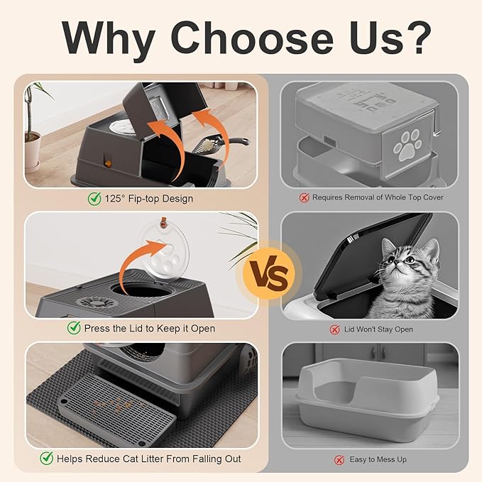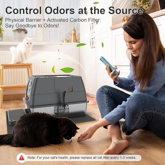 - THREE VERSATILE MODES: The large litter box adopts an easy-to-assemble 3-layer detachable shell, and is available in 3 configurations to suit various needs: fully enclosed, semi-enclosed, and open; The enclosed setup provides a private space for your cat, effectively keeping litter and odors contained, while the semi-enclosed option caters to cats preferring more open spaces and simplifies cleanup for owners