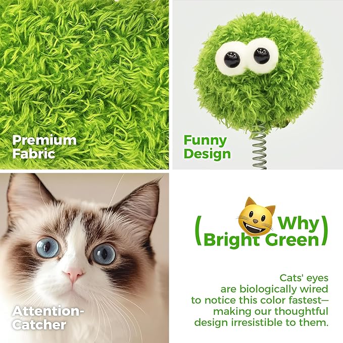 • Interactive Plush Toy Ball with Cute Eyes: The green plush ball has a spring and sound stone to boost appeal, encouraging natural hunting behaviors and energy release. Its cute eye design grabs cats' attention faster than regular toys.
