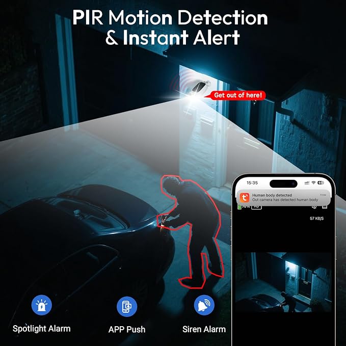 - 🌙 【2.5K Color Night Vision & Spotlight Defense】 See every detail with 2304x1296 resolution (1.5x sharper than 1080p). Color Night Vision Cameras for Home Security activate dual spotlights automatically, capturing full-color footage in darkness. These outdoor security cameras ensure 24/7 clarity.