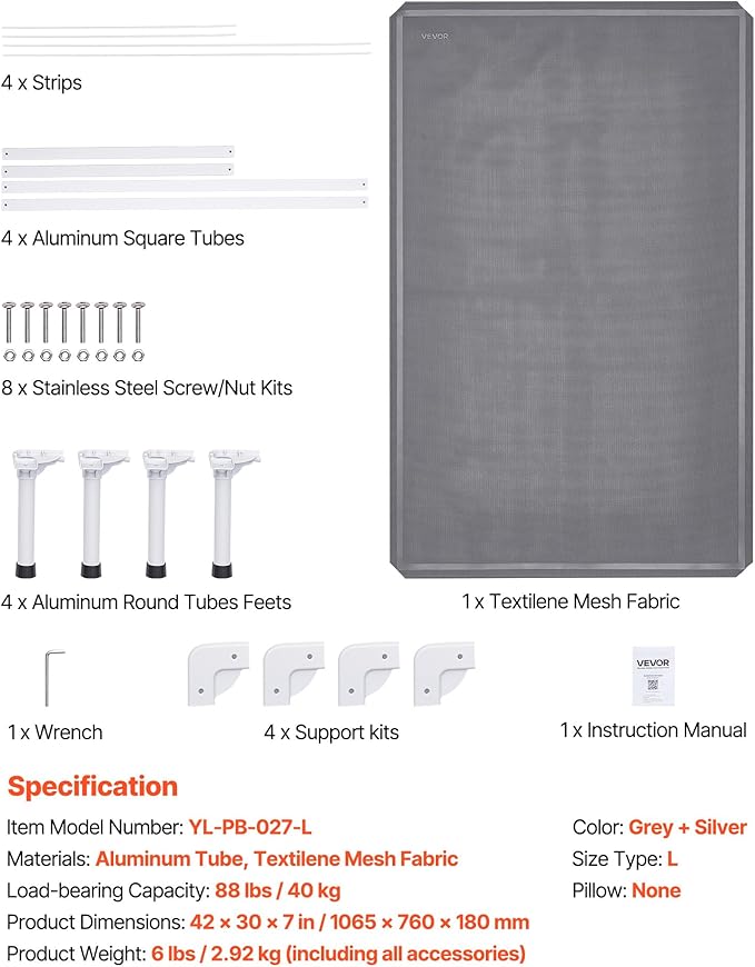 VEVOR Chew Proof Elevated Dog Bed, Portable Raised Dog Cot with Aluminum Tube Metal Frame and Breathable Textilene Mesh, Indoor & Outdoor Pet Cooling Raised Hammock Bed, L, Gray