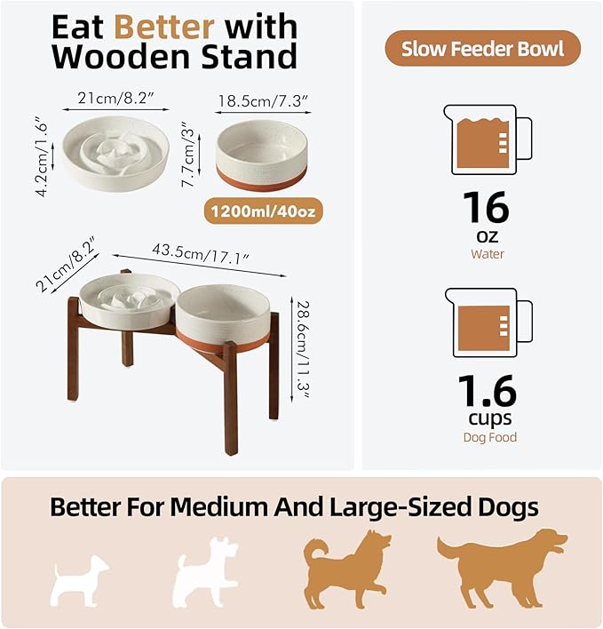 Ceramic 1.6 Cup Raised Slow Feeder Dog Bowl Set, Elevated 7.3inch Bowl and 8.2inch Dish with Acacia Wood Stand for Medium and Large Dogs(2 x Vanilla White+ Stand)