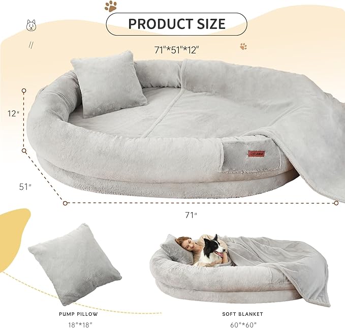 - What Will You Get: Your package includes an orthopedic giant adult dog bed for humans. For a SHORT TIME we're sending a BONUS exquisite workmanship faux short plush blanket of the same material and a plump pillow in a matching color. Experience the unmached comfort of our human dog bed for kids and adults,the perfect fushion of style, durability, and relaxation