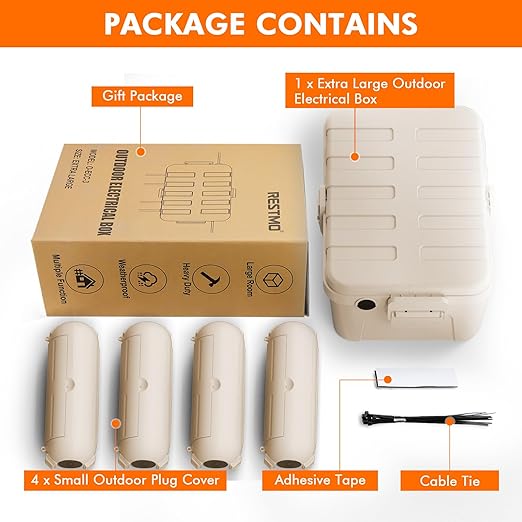 - PACKAGE INCLUDE: 1 x extra-large outdoor electrical box, 4 x small outdoor plug cover, 10 x cable tie and 1 x adhesive tape (not included power strip). Buy this holiday selection bundle to protect all of your holiday lighting decorations.