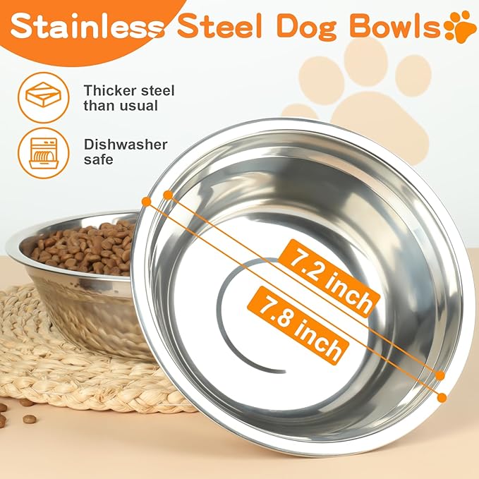 - 🐕【BPA-Free & Low-Maintenance Stainless Steel Bowls】Worried about weird plastic odors seeping into your pup's food? Our 7.8-inch bowls are 100% BPA-free, rust-resistant stainless steel—safe for both food and water, with zero weird tastes. Plus, they're dishwasher-safe (toss 'em in after meals—no scrubbing required!) for super easy cleanup.