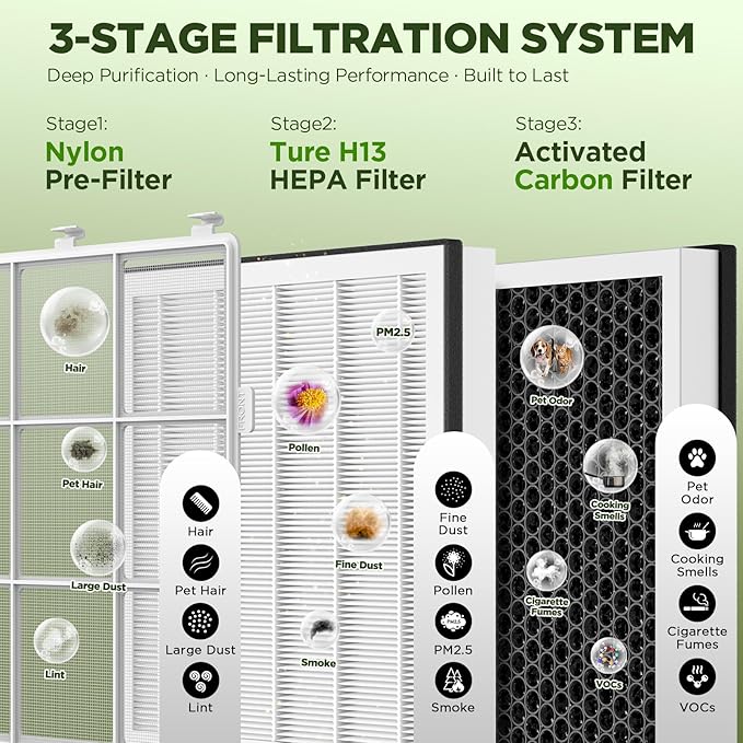- 3-STAGE FILTRATION FOR FRESHER AIR– DBFIT pet air purifiers combine a durable nylon washable pre-filter, a composite True HEPA + honeycomb activated carbon filter, to remove dust, pollen, smoke, pet dander, odors, and VOCs, and have powerful filtration performance against ultra-fine particles. The upgraded honeycomb carbon holds 112.5% more carbon, effectively tackling pet odors, litter box smells, and pet urine. The air purifiers for home pets are ideal for pet owners, families, and anyone seeking cleaner, fresher air at home