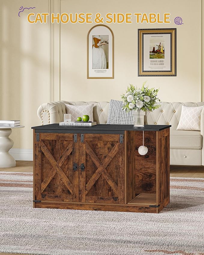 - Multi-purpose Pet Furniture: This rustic style and unique barn door shaped litter box cabinet can be used as a cat litter box or as a finished cat house, giving your cat a comfortable home