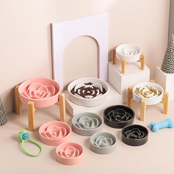 - elevated Ceramic dog bowl provides ease of access to food and water.Reduces bloating and neck strain in dogs. large Slow Feeder Ceramic Material, This bowl is good for fast eater,help for digestion. More Suit For Your Dog: The veterinarian recommends using a ceramic bowl for your dogs. According to investigations, plastic bowls are easy to cause black jaws. If you love your dog, our ceramic slow food bowl will be your best choice. These dog feeder bowls are made from ceramic. Microwave safe, you can heat your dog's food at any time