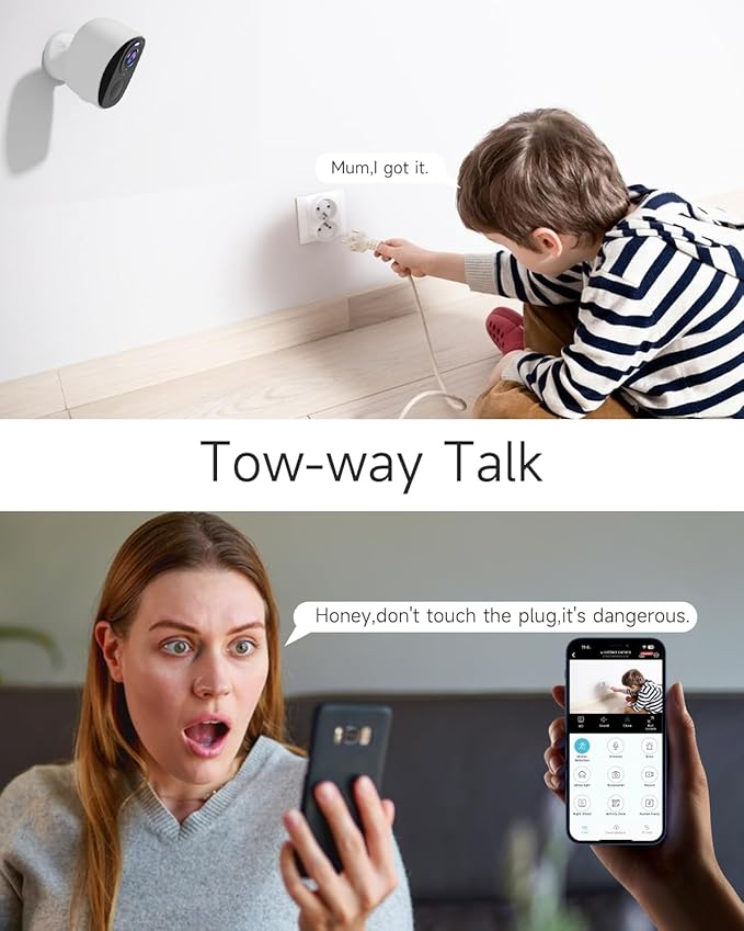 - 【2-Way Audio & Custom Alerts】The security camera is located in the inside of the speaker and microphone, which supports Two-way Audio. You can talk to the people in front of the camera at any time through the mobile app. There are many local alarm sounds in the camera application (such as Dog barking, Ding Dong) to choose from, or you can also import other sounds and set the flash effect, so that it can warn bad people at critical moments!