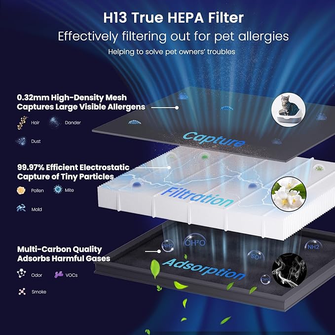 - 【No Hair Stuck & Purify Pet Odor】 Tired of endless pet hair floating around your home? Our U-shaped air inlet design, unlike traditional ones, which prevents pet hair clogging. Featuring a double-sided air intake design, the purification efficiency increased by 100%, capable of purifying an area of 2,500 ft². The air purifier uses a H13 HEPA filter, which can filter pet hair, pet dander, cat litter box odors, pollen, smoke, and 99.97% of fine particles, truly purifying odors.