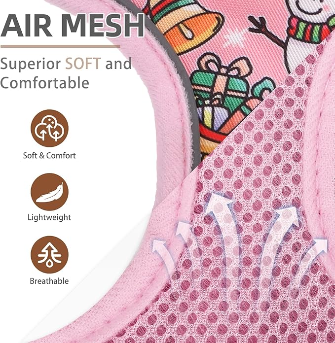 PUPTECK Soft Mesh Christmas Dog Harness and Leash Set Pet Puppy Cat Comfort Padded Vest No Pull Harnesses, Bright Pink, M