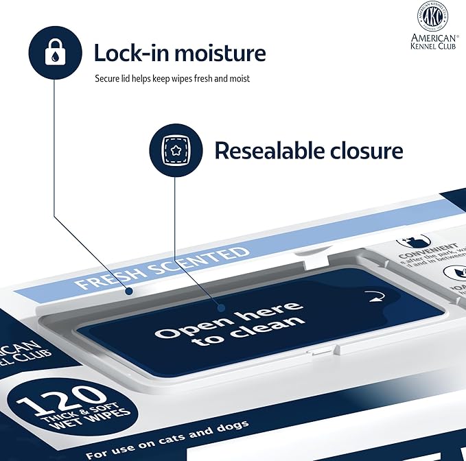 AKC Pet Wipes for Dogs & Cats – Hypoallergenic, Alcohol-Free Wipes for Paws, Face, Ears & Coat – Thick, Gentle Cleaning with Natural Aloe – Available in Lavender, Fresh & Oatmeal Scents