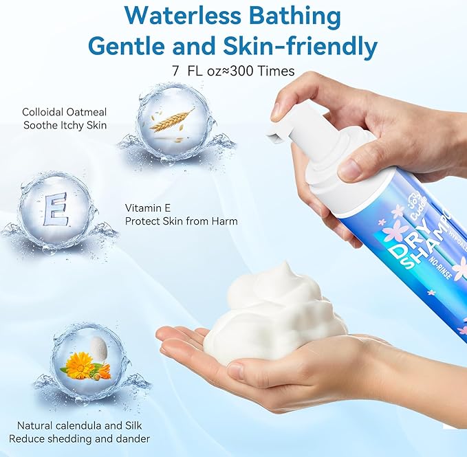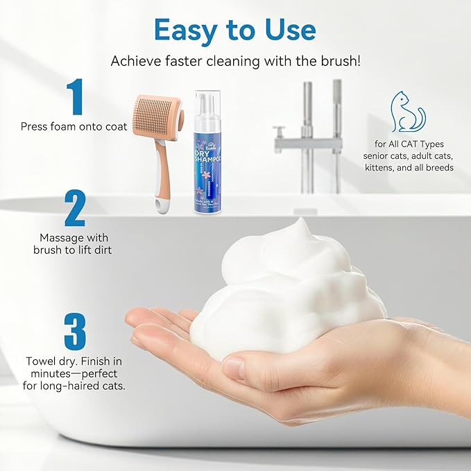 - Effortless 3-Step Routine: Foam, Brush, Done!:Achieve faster cleaning with the brush! ① Press foam onto coat ② Massage with brush to lift dirt ③ Towel dry. Finish in minutes—perfect for long-haired cats. Less stress, more bonding time!