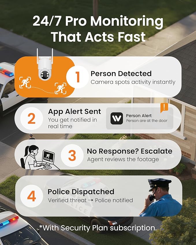 - (3). [ Smart Motion Detection with AI Scene Recognition ] __ Beyond basic motion alerts, this camera uses advanced AI algorithms to recognize human and vehicle-related activities (subscription required). It can identify unusual scenarios—like break-ins, someone cooking, or a person falling—and immediately push alerts to your phone. It also features auto tracking to follow movement across the scene in real time.
