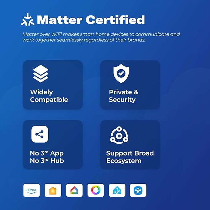 - Effortless Setup & Compact Design: Enjoy effortless setup—just scan the QR code to pair via Matter over Wi-Fi, no hub required. While the compact, safety-certified design ensures a perfect fit in tight spaces without blocking adjacent outlets. Backed by ETL certification and a 1-year warranty for worry-free use.