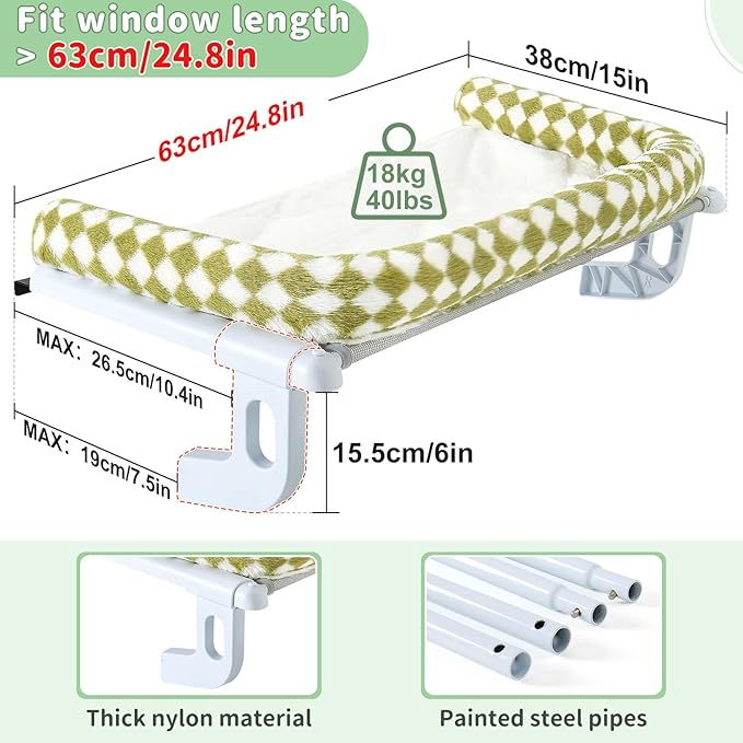 - Important Size Notice – The cat window perch measures 24.8" × 15". Please confirm your windowsill size before purchase. Suitable only for sills with an edge shorter than 2.76", a slot gap over 0.08", and a slot depth of at least 0.6"
