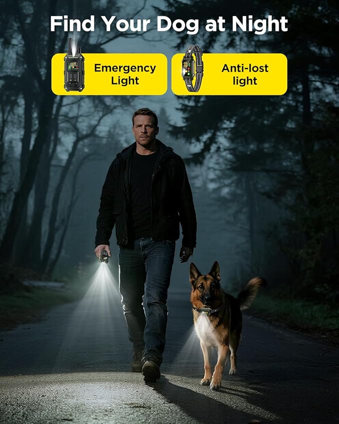 - 【Find Your Dog at Night】The dog shock collar with remote control features dual lighting: Remote-controlled flashlight + collar-mounted strobe light for night visibility. Use the remote's beam to scan dark trails, dense woods, or foggy campsites when your dog is out of sight. Instantly activate the collar's strobe to track your dog or help them locate you. This two-way lighting system ensures connection when it matters most.